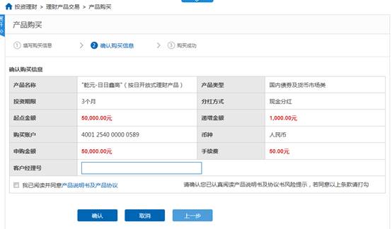 确认理财产品购买信息,确认无误后,点击“确认”。