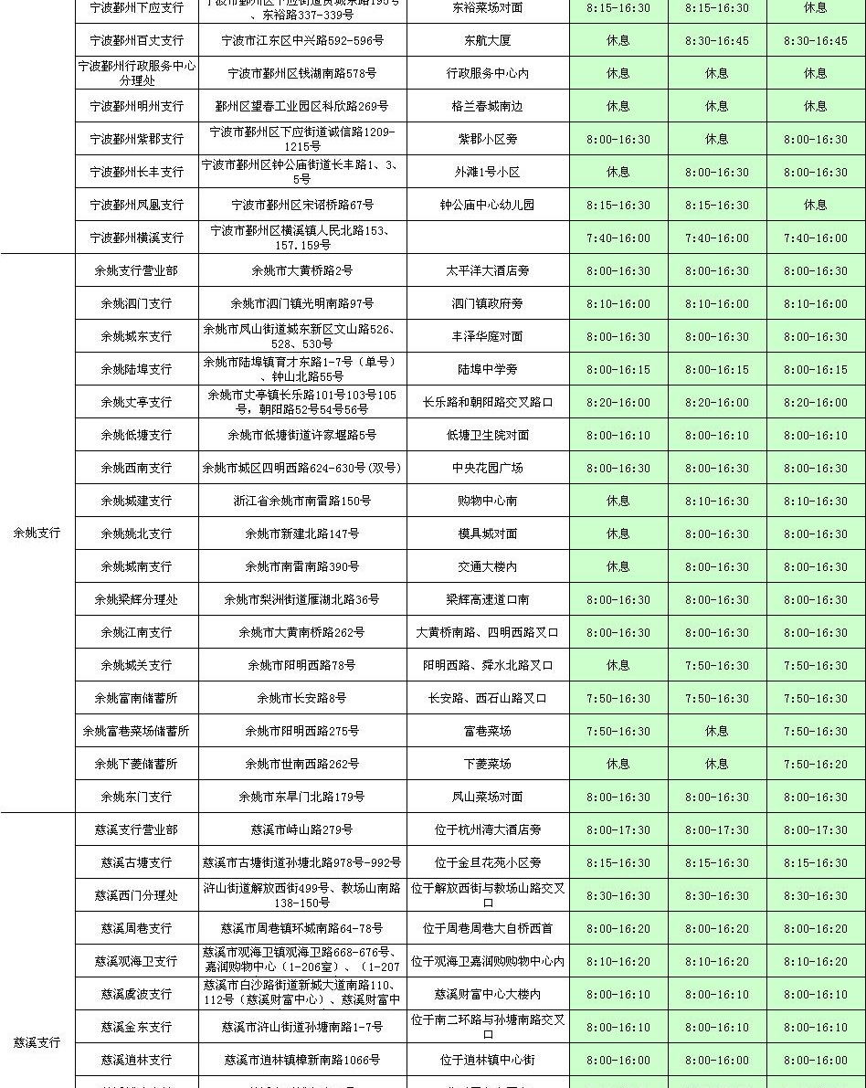 宁波分行2017年清明节期间网点对外营业情况表