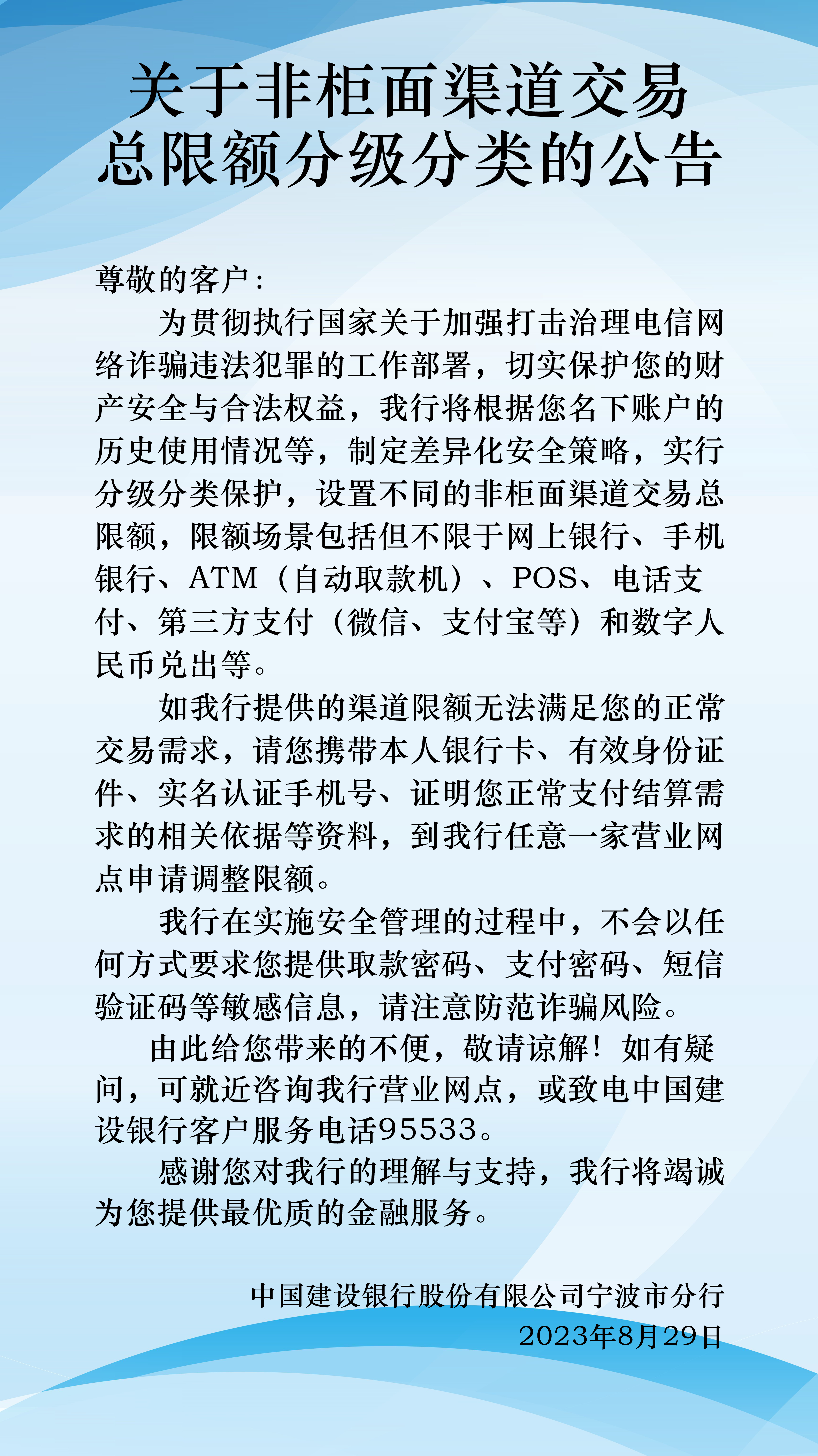关于非柜面渠道交易总限额分级分类的公告